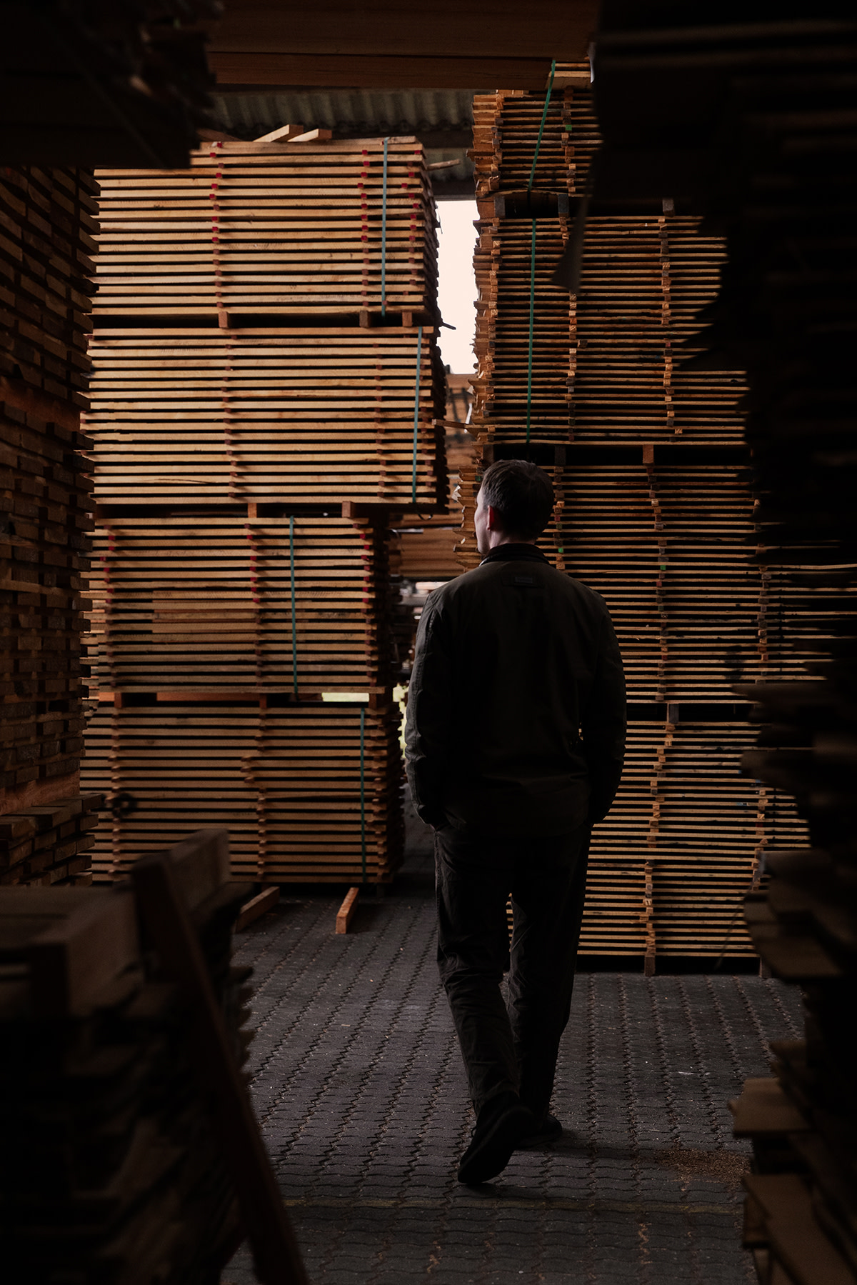 Hans Peter Dinesen among stacks of wooden planks in Dinesen's Production.